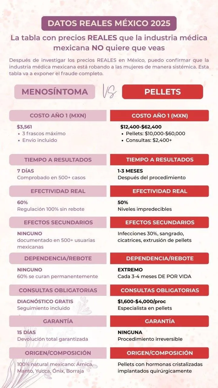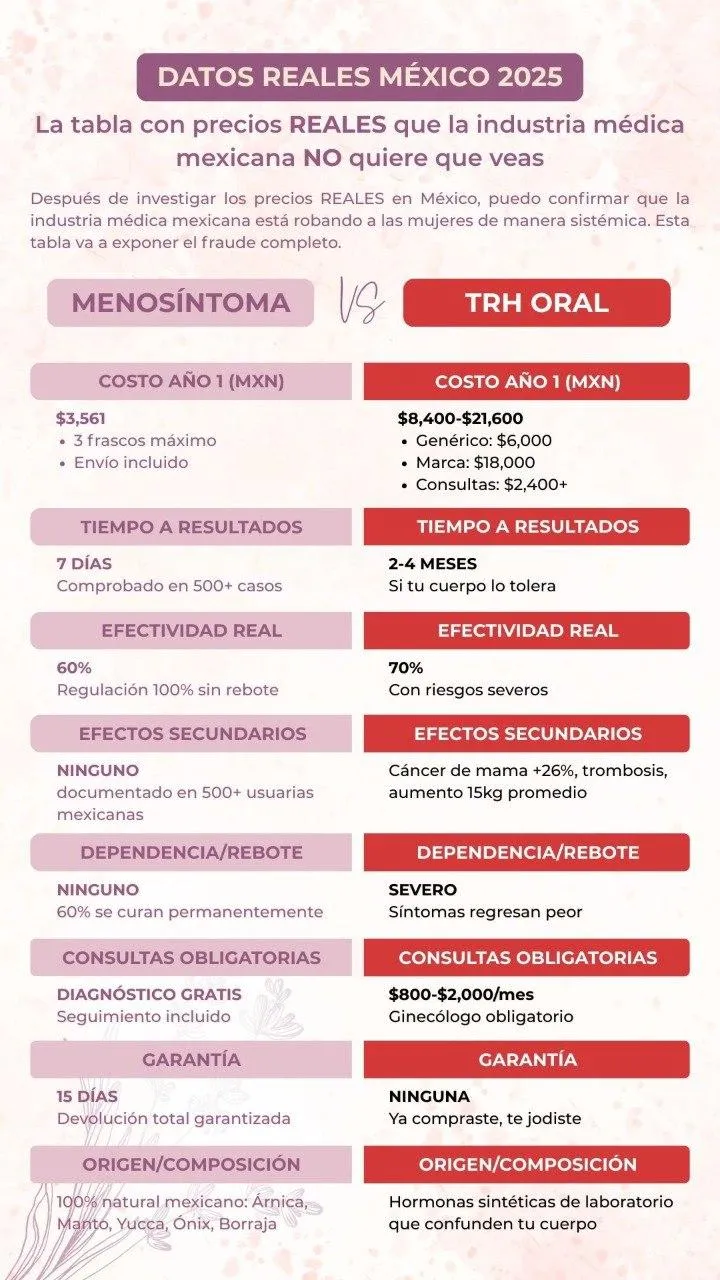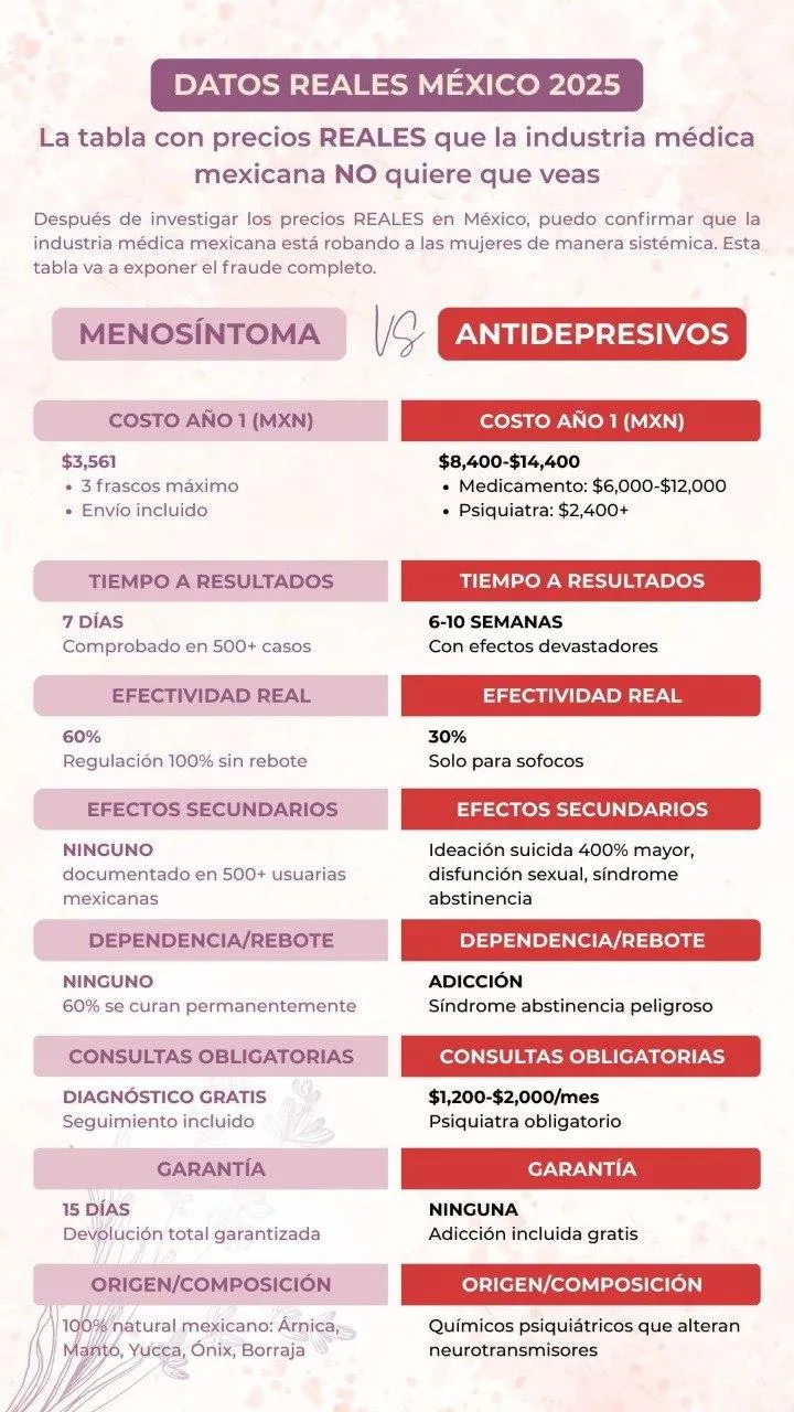 Gasté $45,000 pesos en ginecólogos y tratamientos en 2 años. NADA funcionó. MenoSíntoma me costó $1,497 y en 1 mes eliminó TODOS mis síntomas. Es la mejor inversión de mi vida