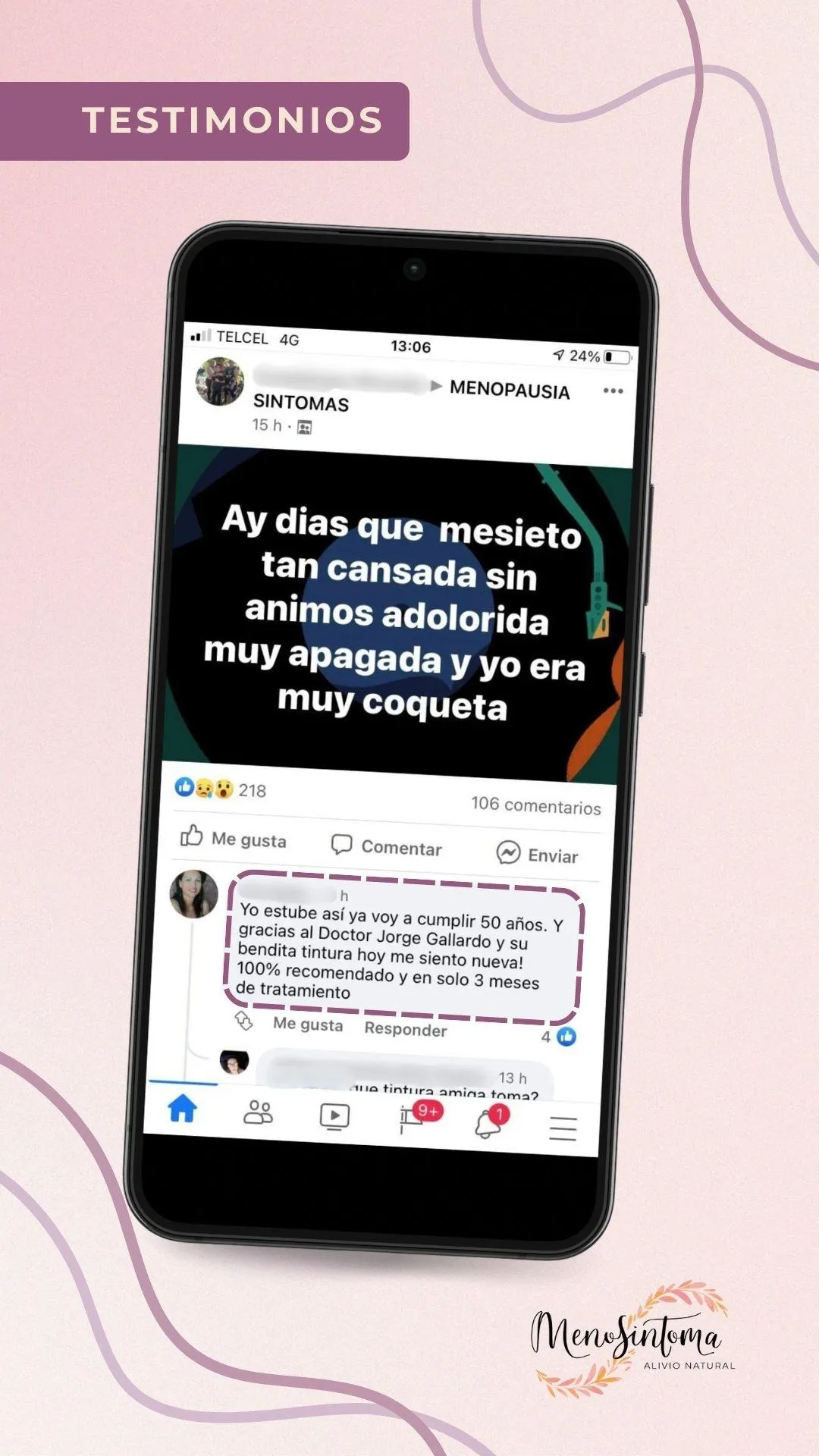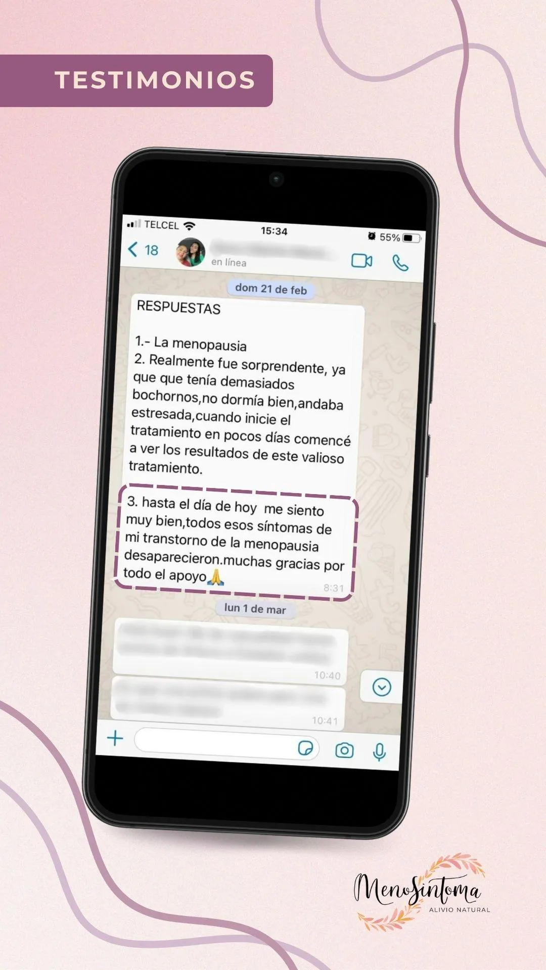 "Los médicos me dijeron que necesitaba antidepresivos por mis cambios de humor. ¡Era la menopausia! MenoSíntoma me devolvió mi estabilidad emocional en 2 semanas. Mis hijos me dijeron: 'Mami, ya no tienes cara de enojada todo el tiempo'."